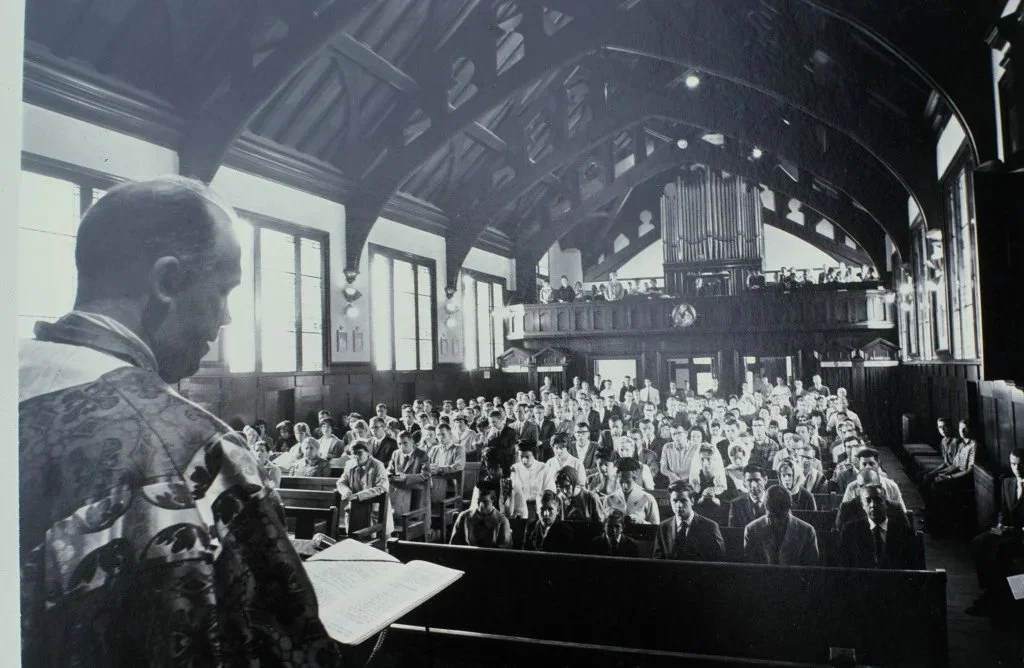 In 1907, Archbishop Riordan appointed Fr. Thomas Verner Moore, the first Paulist Father, to serve Berkeley’s Catholic students. That same year, the Archbishop purchased property on Ridge Road for a permanent home. With funds donated for his silver jubilee, a new Newman Hall—designed by renowned architect Bernard Maybeck—was built. It included a 400-seat chapel, social areas, offices, Paulist residences, and even a basement bowling alley.