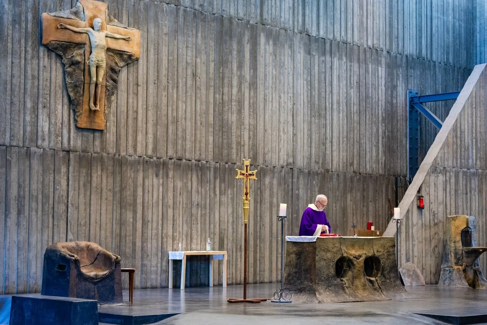The congregation gathers closely around a gently raised sanctuary, emphasizing unity in worship